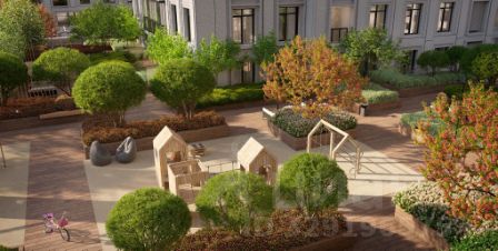 Закрытая охраняемая территория, кафе, рестораны, подземный паркинг, на первых этажах ЖК — торгово-развлекательный центр, на крыше трц - приватный зелёный двор-сад с зоной отдыха, спортивными и детскими площадками из эко-материалов.