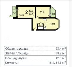 Площадь: 64,3 м2 Три изолированные комнаты и 2 Лоджии