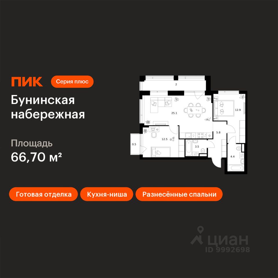 Продаётся 2-комн. квартира площадью 66,7 кв.м на 10 этаже 16 этажного дома (Корпус 2.6/1.3, Секция 3) проекта ПИК Бунинская набережная. Светлый просторный подъезд на уровне земли, функциональная планировка, большие окна, c отделкой.