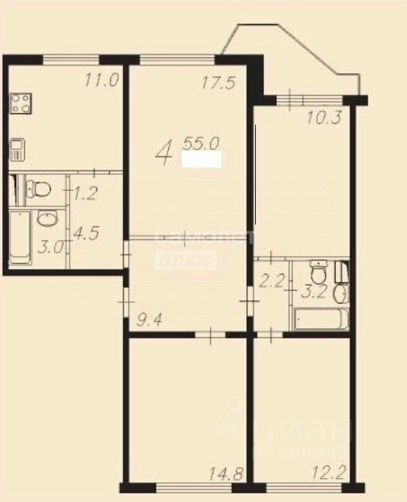 Общая площадь квартиры составляет 90,5 квадратных метра, четыре комнаты площадью 17,5, 10,4, 12,1 и 14,9 кв.м. Площадь кухни — 10,8 квадратных метра. Просторная прихожая 9,2 кв. м. , а главное 2 больших совмещенных санузла.