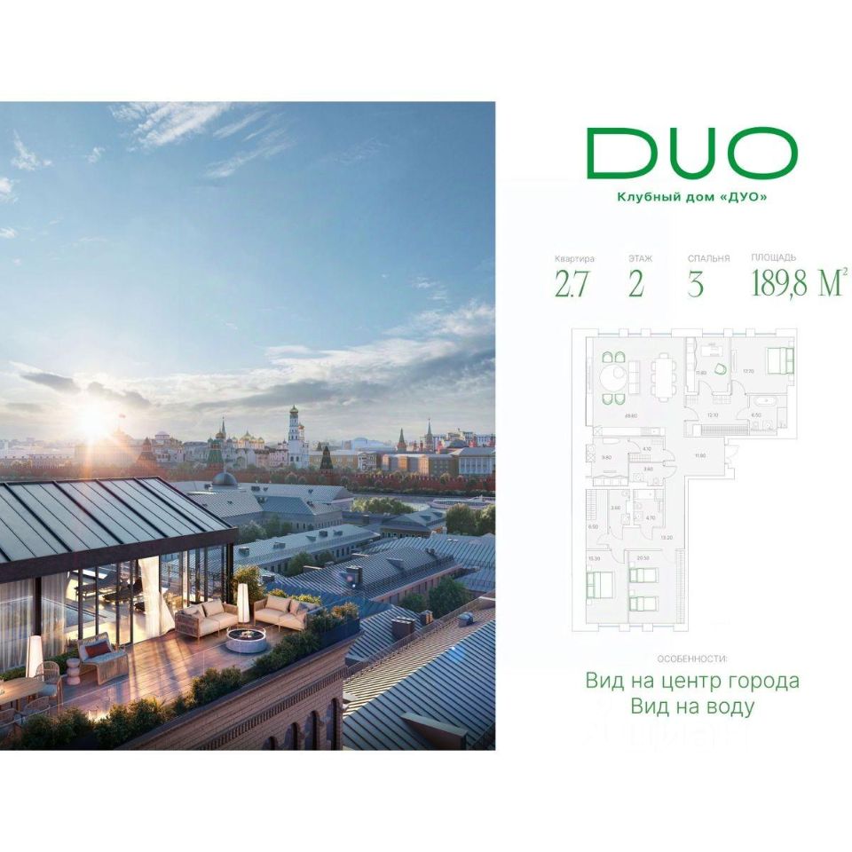 Клубный дом DUO расположен в самом центре города, на Софийской набережной острова Балчуг в нескольких минутах от Кремля. DUO воплощает в себе дуальность наследия прошлого и архитектуры будущего. Историческое наследие дополняется современными архитектурными решениями и технологиями, создавая пространство вне времени. Всего в DUO будет 51 квартира коллекционного уровня, среди которых семь особенных лотов: четыре пентхауса, две двухуровневые квартиры, а также роскошный пентхаус площадью 1182 кв. м с собственным лифтом, камином, бассейном и террасой, откуда весь центр столицы виден как на ладони. Площадь квартир варьируется от 48 до 1182 кв. м, а из 75% лотов будут открываться живописные виды на Москву-реку. Клубный формат Duo раскрывается не только в малом числе квартир, но и в приватной инфраструктуре высокого класса. Для душевного вечера в кругу друзей можно будет зайти в винный зал или устроить закрытый сеанс в кинозале с мягкими диванами. В бизнес-гостиной — комфортно провести встречу, а детей на это время оставить в уютной детской комнате. В доме также будет работать фитнес-клуб с современными тренажерами и другим необходимым оборудованием для эффективных тренировок, а расслабиться после насыщенного дня можно в собственном спа-комплексе DUО.