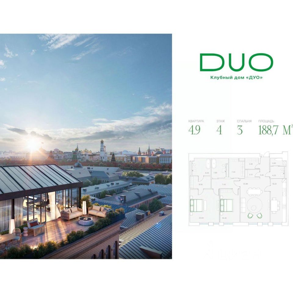Клубный дом DUO расположен в самом центре города, на Софийской набережной острова Балчуг в нескольких минутах от Кремля. DUO воплощает в себе дуальность наследия прошлого и архитектуры будущего. Историческое наследие дополняется современными архитектурными решениями и технологиями, создавая пространство вне времени. Всего в DUO будет 51 квартира коллекционного уровня, среди которых семь особенных лотов: четыре пентхауса, две двухуровневые квартиры, а также роскошный пентхаус площадью 1182 кв. м с собственным лифтом, камином, бассейном и террасой, откуда весь центр столицы виден как на ладони. Площадь квартир варьируется от 48 до 1182 кв. м, а из 75% лотов будут открываться живописные виды на Москву-реку. Клубный формат Duo раскрывается не только в малом числе квартир, но и в приватной инфраструктуре высокого класса. Для душевного вечера в кругу друзей можно будет зайти в винный зал или устроить закрытый сеанс в кинозале с мягкими диванами. В бизнес-гостиной — комфортно провести встречу, а детей на это время оставить в уютной детской комнате. В доме также будет работать фитнес-клуб с современными тренажерами и другим необходимым оборудованием для эффективных тренировок, а расслабиться после насыщенного дня можно в собственном спа-комплексе DUО.