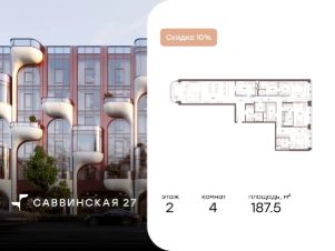 В историческом районе Хамовники продаются 4-к апартаменты площадью 187.50 кв.м, расположенные на 2 этаже делюкс-резиденции Саввинская 27.