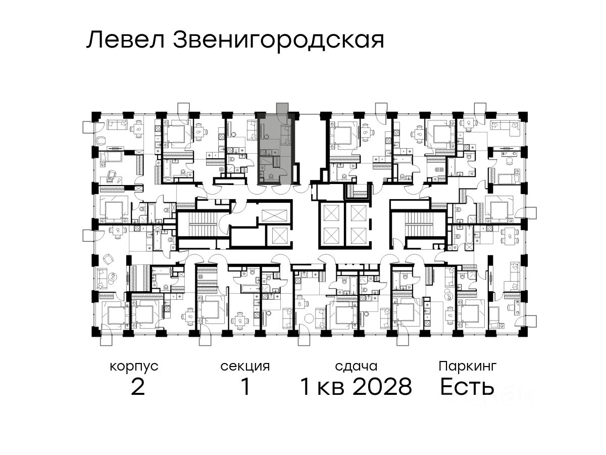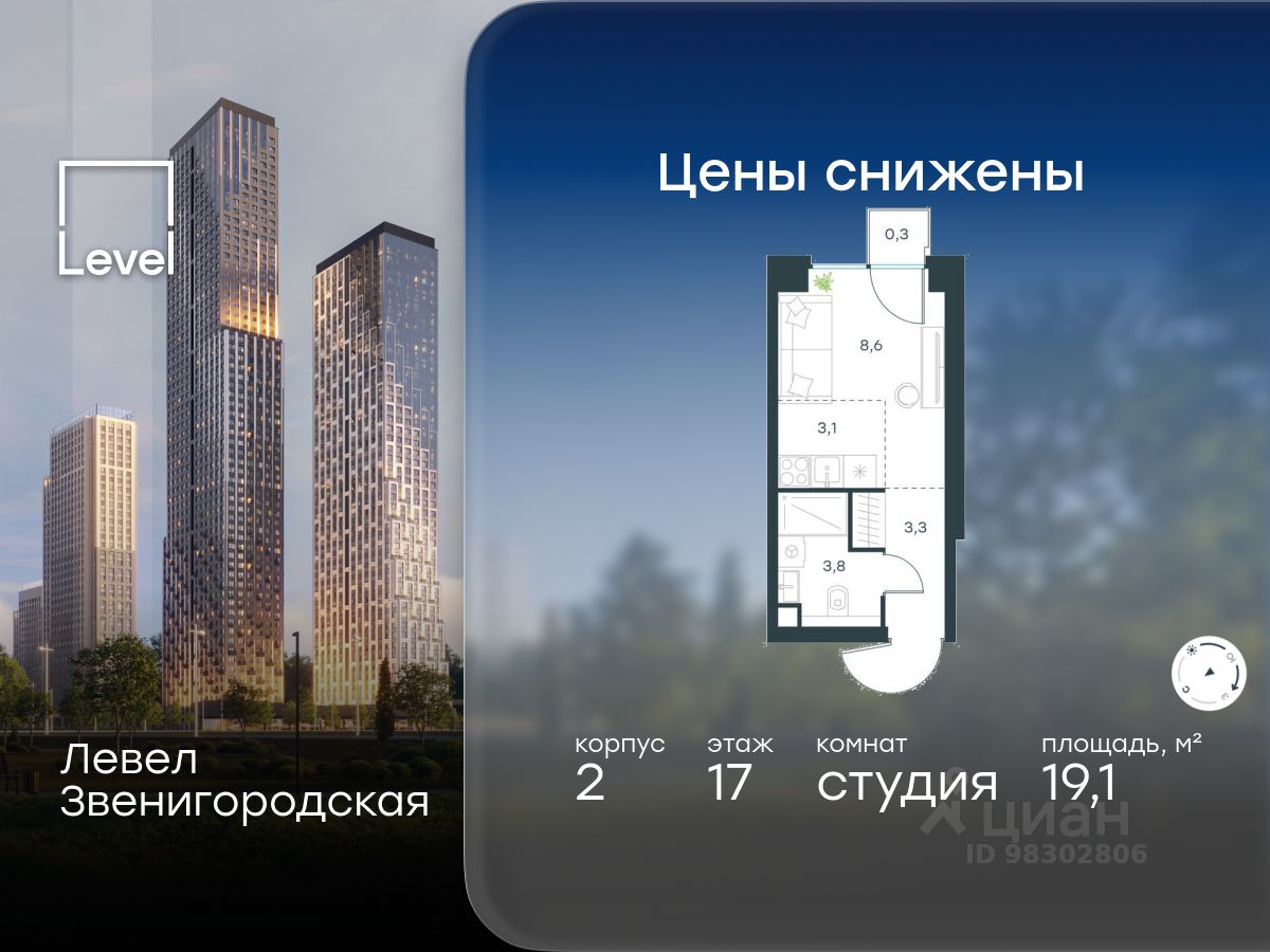 В жилом квартале продаётся студия площадью 19.10 кв.м без отделки. Квартира расположена на 17 этаже 64 этажного корпуса 2 в жилом комплексе комфорт класса Левел Звенигородская (компания Level Group/Левел групп).