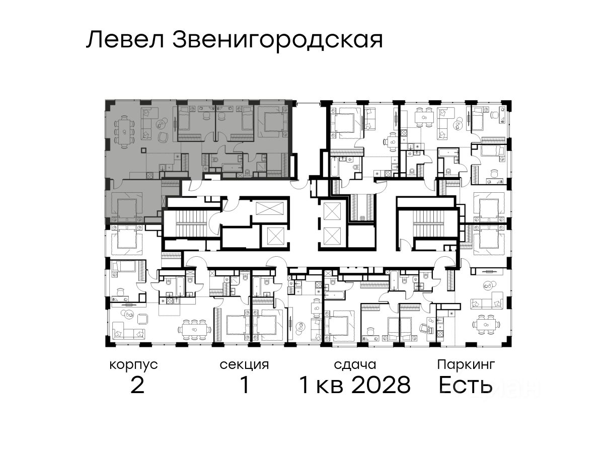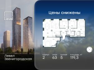 В жилом квартале продаётся многокомнатная квартира площадью 119.30 кв.м без отделки. Квартира расположена на 63 этаже 64 этажного корпуса 2 в жилом комплексе комфорт класса Левел Звенигородская (компания Level Group/Левел групп).