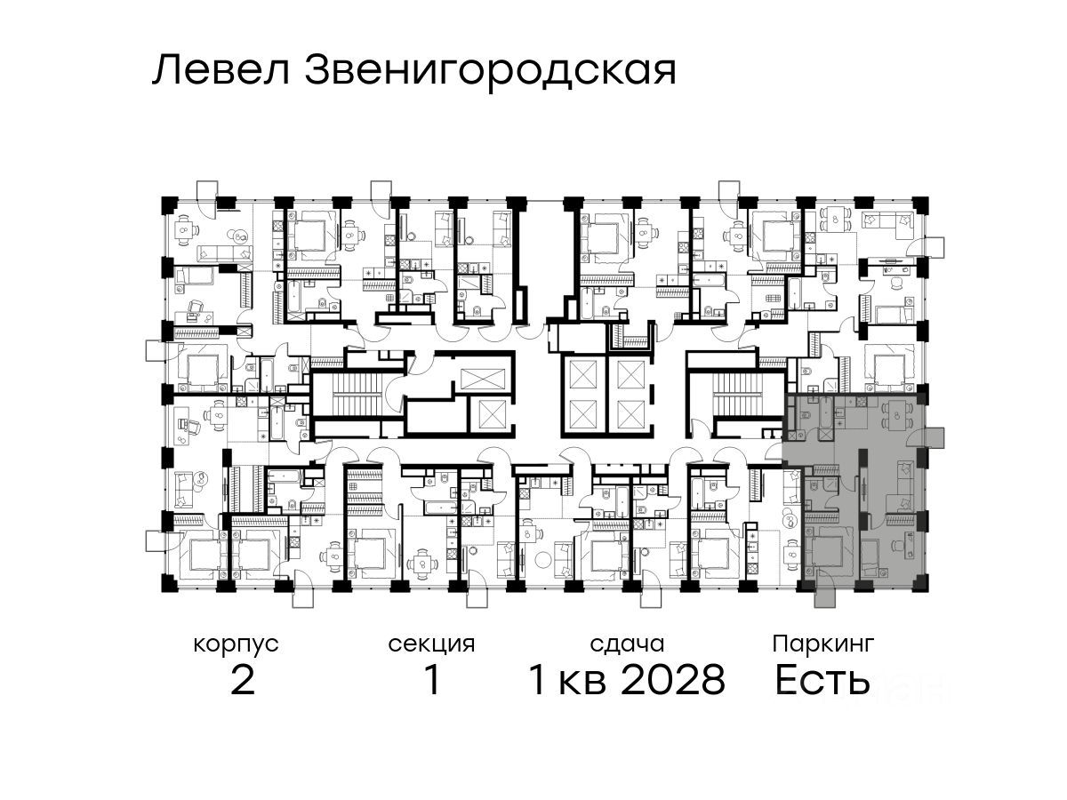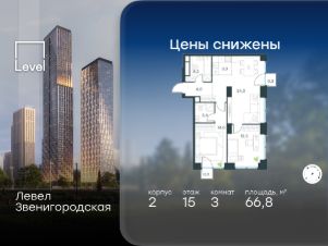 В жилом квартале продаётся 3-комнатная квартира площадью 66.80 кв.м без отделки. Квартира расположена на 15 этаже 64 этажного корпуса 2 в жилом комплексе комфорт класса Левел Звенигородская (компания Level Group/Левел групп).