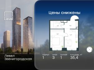 В жилом квартале продаётся 1-комнатная квартира площадью 35.40 кв.м с предчистовой отделкой. Квартира расположена на 3 этаже 48 этажного корпуса 1 в жилом комплексе комфорт класса Левел Звенигородская (компания Level Group/Левел групп).