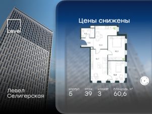 В жилом квартале, расположенном в южной части района Западное Дегунино, продаётся 3-комнатная квартира площадью 60.60 кв.м без отделки. Квартира расположена на 39 этаже 40-этажного корпуса 5 в жилом комплексе комфорт-класса Левел Селигерская (компания Level Group/Левел групп).