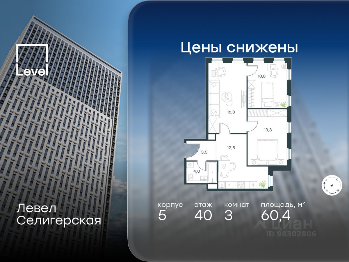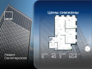 Цена указана с учётом скидки при 100%-й оплате, несубсидированной ипотеке, рассрочке (кроме программы "Рассрочка 0%"). В жилом квартале, расположенном в южной части района Западное Дегунино, продаётся 3-комнатная квартира площадью 60.40 кв.м без отделки. Квартира расположена на 40 этаже 40-этажного корпуса 5 в жилом комплексе комфорт-класса Левел Селигерская (компания Level Group/Левел групп). Отличная транспортная доступность: - 10 мин. пешком до станции метро "Верхние Лихоборы"; - 15 мин. пешком до станции метро "Селигерская"; - 20 мин. пешком до станции МЦД-3 "Моссельмаш"; - 11 мин. на авто до МКАД; - 13 мин. на авто до ТТК; - 16 мин. на авто до Садового кольца. Расположение Район отличается богатой социальной инфраструктурой: школы, детские сады, поликлиники, магазины, фитнес-клубы, торговые центры - всё близко к дому. Рядом с Левел Селигерская расположено 5 парковых зон. В 3 минутах от дома расположен перспективный сквер-парк. В 10 минутах пешком находится парк им. Святослава Фёдорова, в 13 минутах на велосипеде - парк "Ангарские пруды". В 7-11 минутах на автомобиле - два крупных природных объекта: Тимирязевский парк и Главный ботанический сад Российской академии наук. Благоустройство Внутренние дворы жилого комплекса огорожены от машин, а их функциональное наполнение отличается в зависимости от очереди строительства. На территории 2-й очереди жителей ждут уютные навесы с качелями, павильон-читальня, волейбольная площадка, беседки, а также детские и спортивные площадки. Технологии и инженерия Для входа на территорию комплекса предусмотрен единый ключ доступа. Все общественные зоны оснащены камерами видеонаблюдения, по заявке собственнику предоставляется возможность просмотра изображения отдельных видеокамер на его мобильном устройстве. При въезде в паркинг функционирует система распознавания госномеров. Кроме того, для комфорта жителей создано мобильное приложение, с помощью которого можно удаленно контролировать доступ на придомовую и жилую территории. Другие преимущества жилого комплекса - Высокая освещённость квартир: в большинстве из них не менее трёх окон; - Супермаркет, магазины, кафе, пекарни и многое другое на первых этажах домов; - Частный детский сад; - Стильные дизайнерские лобби с высокими потолками до 4,3 м. и окнами в пол, для питомцев предусмотрена лапомойка; - 30+ планировочных решений: от компактных студий до просторных семейных квартир; - С каждого этажа дома на лифте можно спуститься в подземный отапливаемый паркинг."