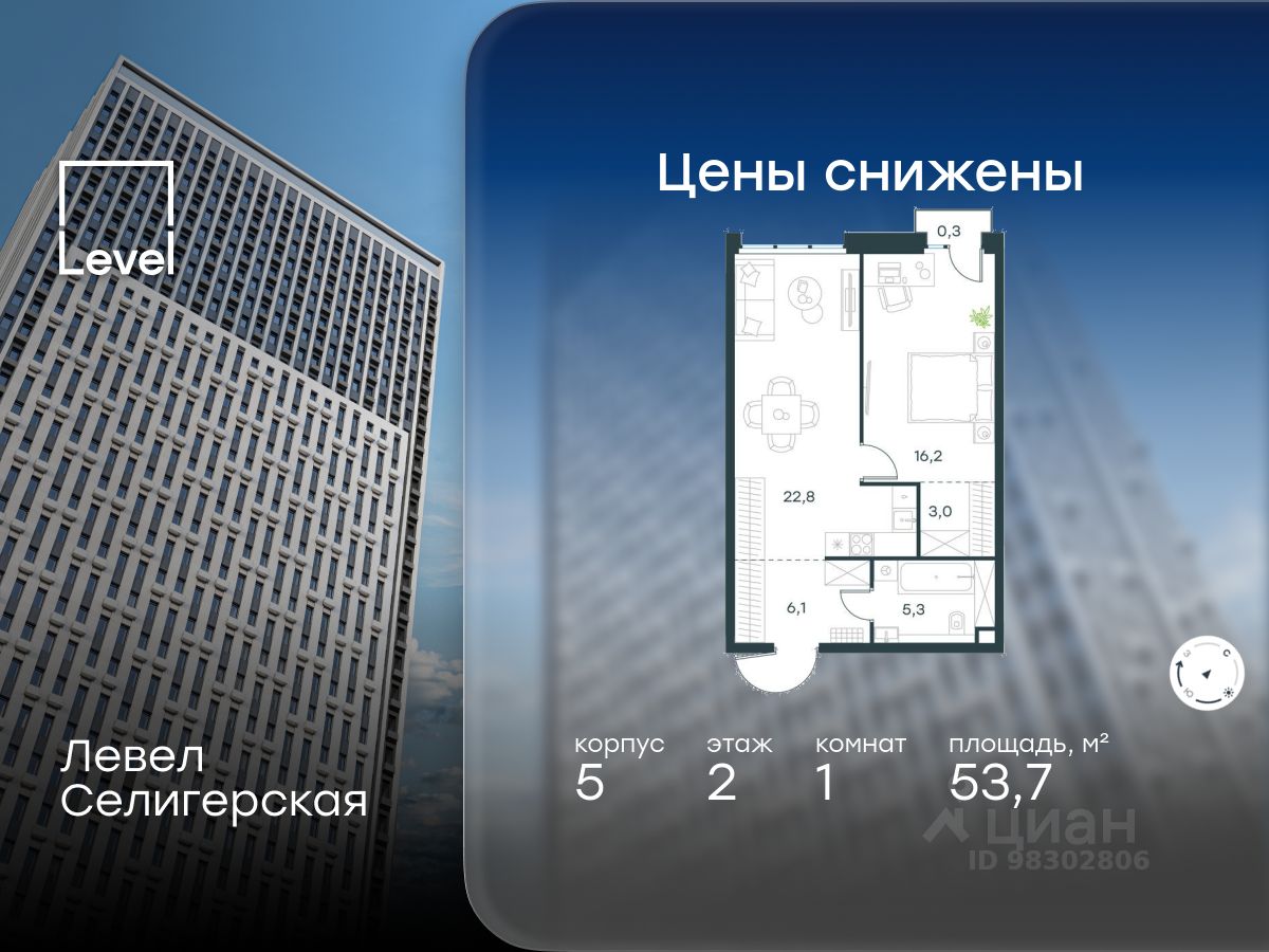 Цена указана с учётом скидки при 100%-й оплате, несубсидированной ипотеке, рассрочке (кроме программы "Рассрочка 0%"). В жилом квартале, расположенном в южной части района Западное Дегунино, продаётся 1-комнатная квартира площадью 53.70 кв.м без отделки. Квартира расположена на 2 этаже 40-этажного корпуса 5 в жилом комплексе комфорт-класса Левел Селигерская (компания Level Group/Левел групп). Отличная транспортная доступность: - 10 мин. пешком до станции метро "Верхние Лихоборы"; - 15 мин. пешком до станции метро "Селигерская"; - 20 мин. пешком до станции МЦД-3 "Моссельмаш"; - 11 мин. на авто до МКАД; - 13 мин. на авто до ТТК; - 16 мин. на авто до Садового кольца. Расположение Район отличается богатой социальной инфраструктурой: школы, детские сады, поликлиники, магазины, фитнес-клубы, торговые центры - всё близко к дому. Рядом с Левел Селигерская расположено 5 парковых зон. В 3 минутах от дома расположен перспективный сквер-парк. В 10 минутах пешком находится парк им. Святослава Фёдорова, в 13 минутах на велосипеде - парк "Ангарские пруды". В 7-11 минутах на автомобиле - два крупных природных объекта: Тимирязевский парк и Главный ботанический сад Российской академии наук. Благоустройство Внутренние дворы жилого комплекса огорожены от машин, а их функциональное наполнение отличается в зависимости от очереди строительства. На территории 2-й очереди жителей ждут уютные навесы с качелями, павильон-читальня, волейбольная площадка, беседки, а также детские и спортивные площадки. Технологии и инженерия Для входа на территорию комплекса предусмотрен единый ключ доступа. Все общественные зоны оснащены камерами видеонаблюдения, по заявке собственнику предоставляется возможность просмотра изображения отдельных видеокамер на его мобильном устройстве. При въезде в паркинг функционирует система распознавания госномеров. Кроме того, для комфорта жителей создано мобильное приложение, с помощью которого можно удаленно контролировать доступ на придомовую и жилую территории. Другие преимущества жилого комплекса - Высокая освещённость квартир: в большинстве из них не менее трёх окон; - Супермаркет, магазины, кафе, пекарни и многое другое на первых этажах домов; - Частный детский сад; - Стильные дизайнерские лобби с высокими потолками до 4,3 м. и окнами в пол, для питомцев предусмотрена лапомойка; - 30+ планировочных решений: от компактных студий до просторных семейных квартир; - С каждого этажа дома на лифте можно спуститься в подземный отапливаемый паркинг."