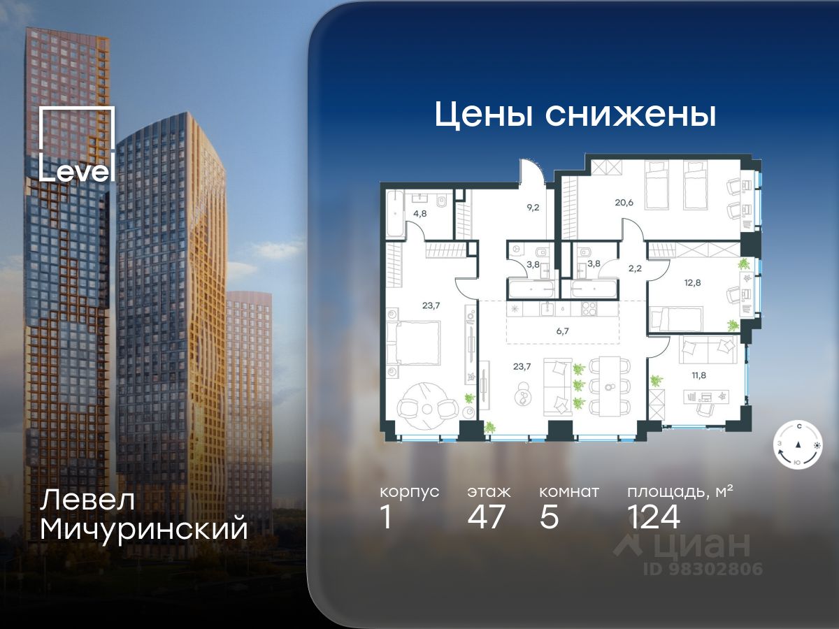 В жилом квартале, расположенном на границе с природным заказником "Долина реки Очаковки", продаётся многокомнатная квартира площадью 124.00 кв.м без отделки. Квартира расположена на 47 этаже 54-этажного корпуса 1 в жилом комплексе бизнес-класса Левел Мичуринский (компания Level Group/Левел групп).