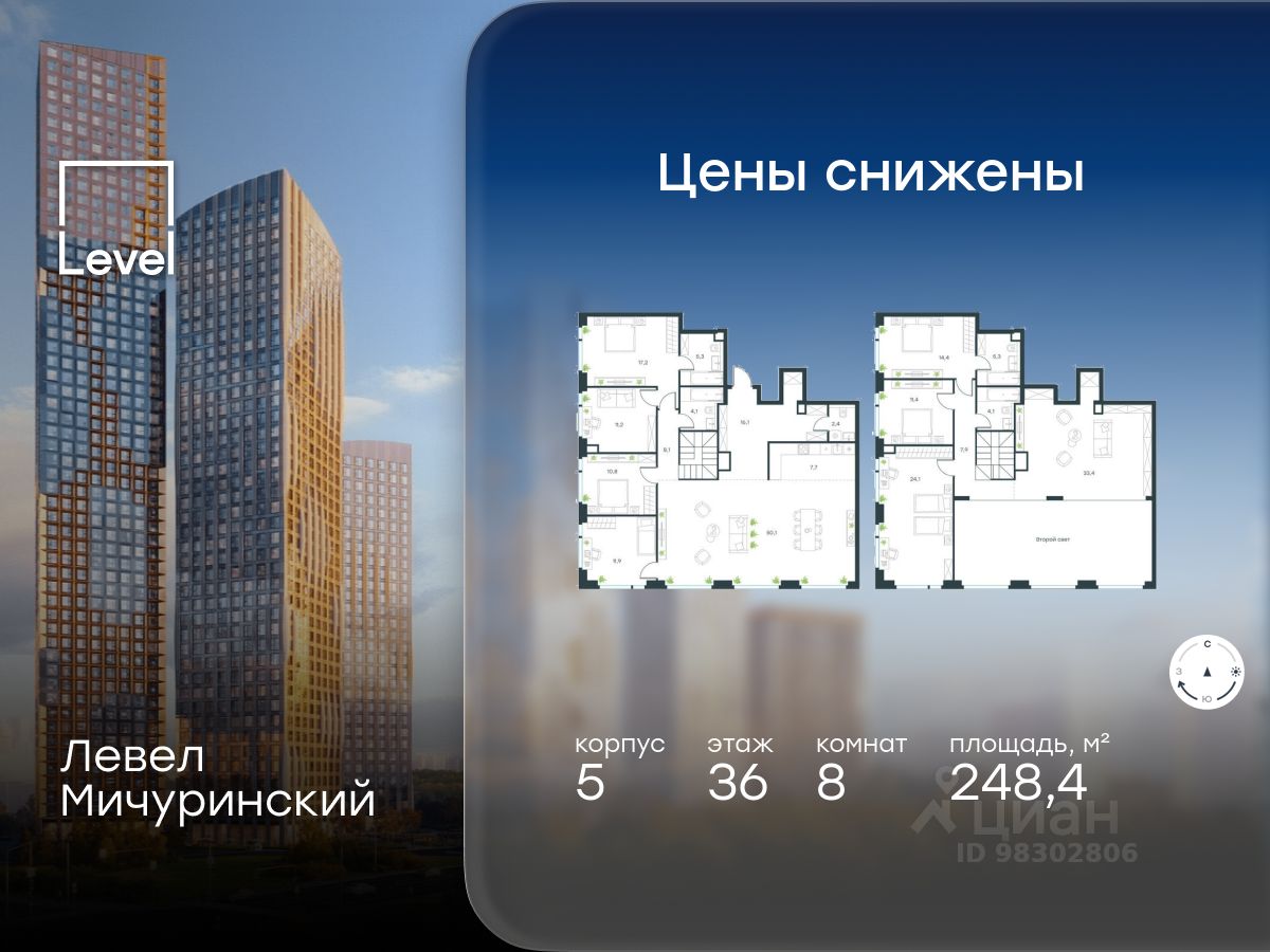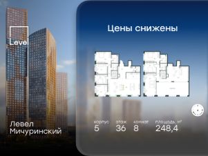 В жилом квартале, расположенном на границе с природным заказником "Долина реки Очаковки", продаётся многокомнатная квартира площадью 248.40 кв.м без отделки. Квартира расположена на 36 этаже 37-этажного корпуса 5 в жилом комплексе бизнес-класса Левел Мичуринский (компания Level Group/Левел групп).