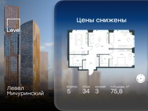 В жилом квартале, расположенном на границе с природным заказником "Долина реки Очаковки", продаётся 3-комнатная квартира площадью 75.80 кв.м с отделкой white box. Квартира расположена на 34 этаже 37-этажного корпуса 5 в жилом комплексе бизнес-класса Левел Мичуринский (компания Level Group/Левел групп).