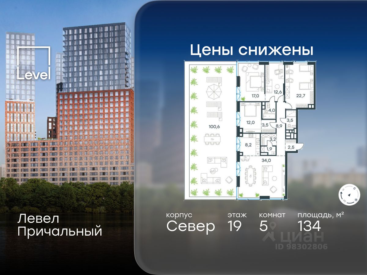 В готовом жилом комплексе на набережной Москвы-реки продается многокомнатная квартира площадью 134 кв.м без отделки. Квартира расположена на 19 этаже 32 этажного корпуса " Север" в жилом комплексе бизнес-класса Левел Причальный (компания Level Group/Левел групп).