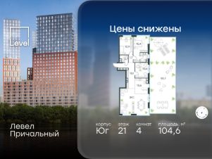 В готовом жилом комплексе на набережной Москвы-реки продается 4-комнатная квартира площадью 104,6 кв.м без отделки. Квартира расположена на 21 этаже 32 этажного корпуса " Юг" в жилом комплексе бизнес-класса Левел Причальный (компания Level Group/Левел групп).