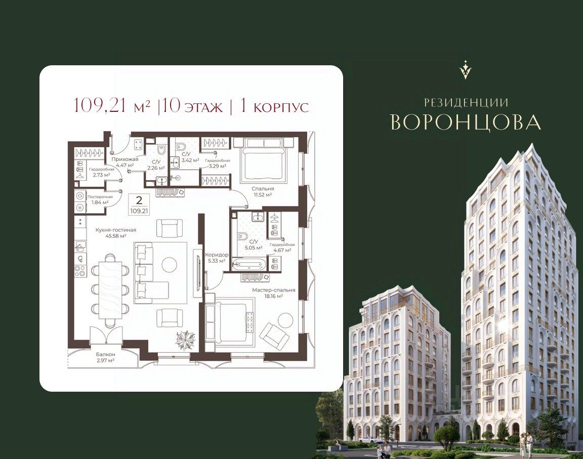 Продается 2-к квартира площадью 109.21 кв. м без отделки. Квартира находится на 10 этаже.