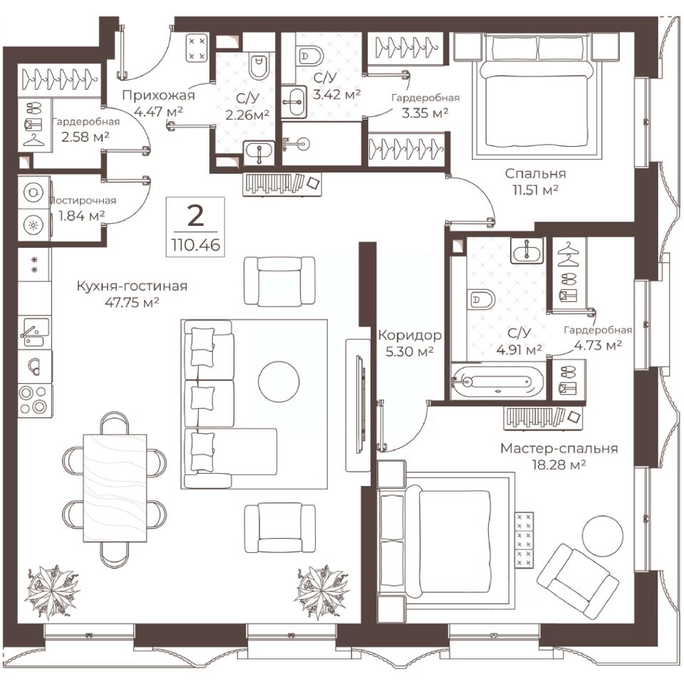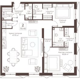 Продается 2-к квартира площадью 110.46 кв. м без отделки. Квартира находится на 9 этаже.