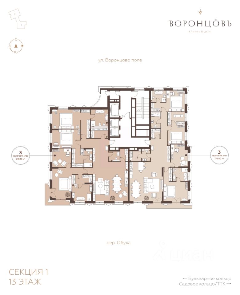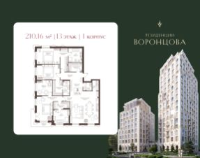 Продается 3-к квартира площадью 210.16 кв. м без отделки. Квартира находится на 13 этаже.