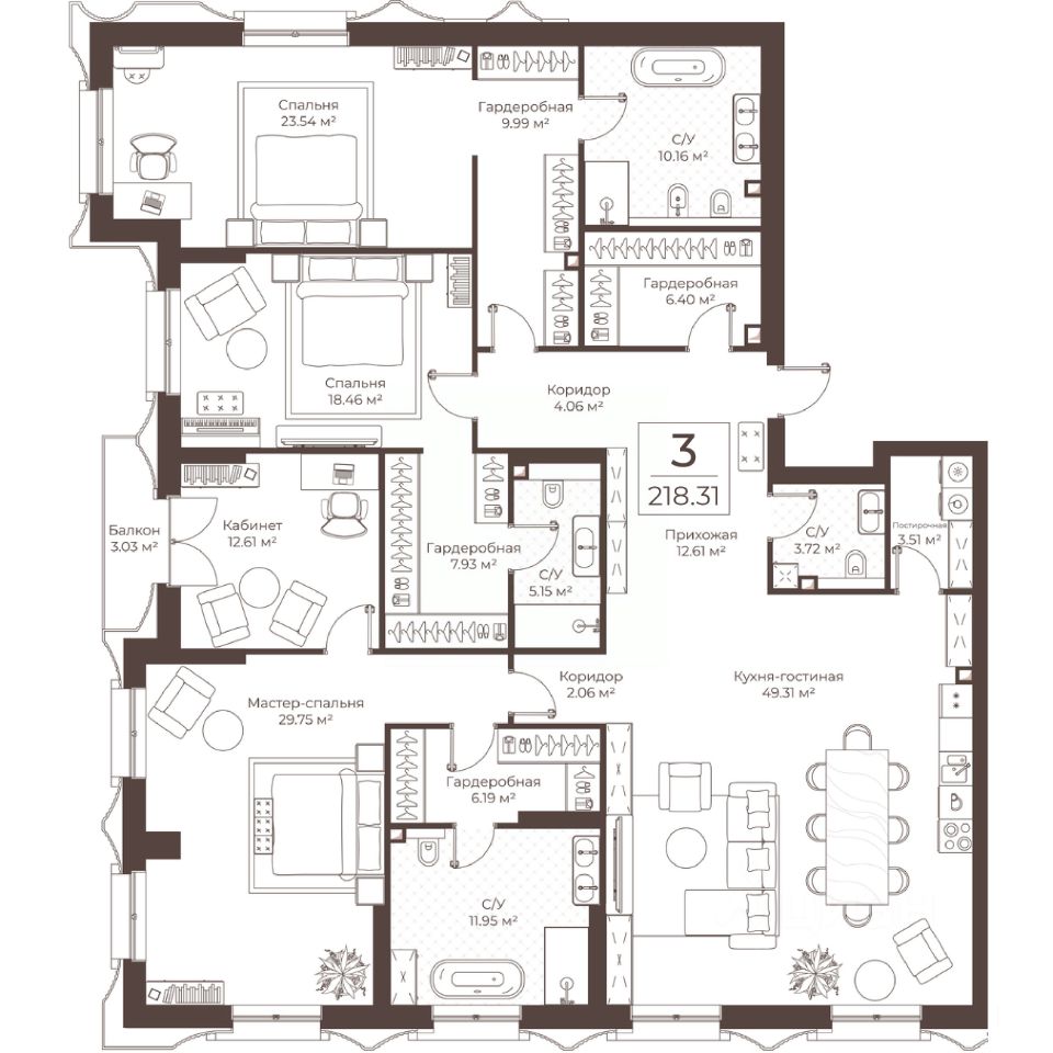 Продается 3-к квартира площадью 218.31 кв. м без отделки. Квартира находится на 11 этаже.