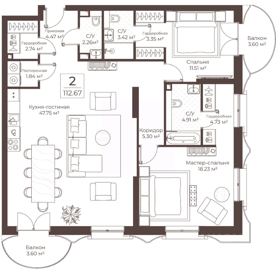 Продается 2-к квартира площадью 112.67 кв. м без отделки. Квартира находится на 4 этаже.