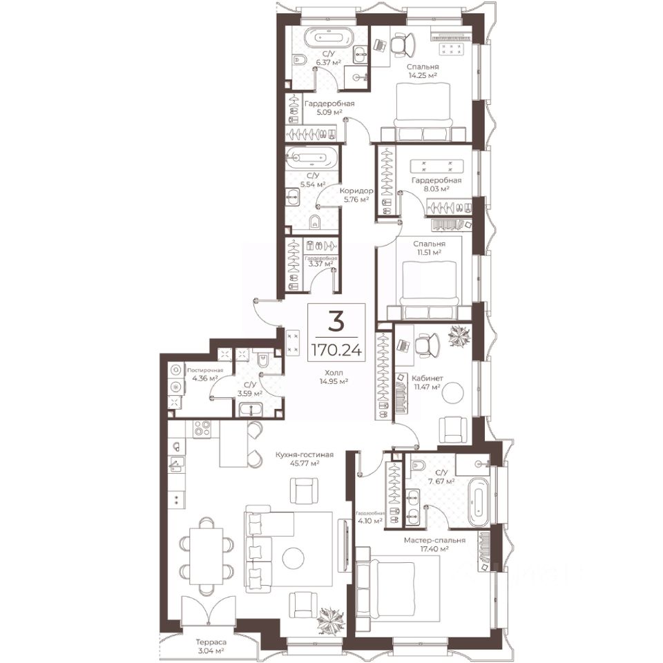 Продается 3-к квартира площадью 170.24 кв. м без отделки. Квартира находится на 15 этаже.