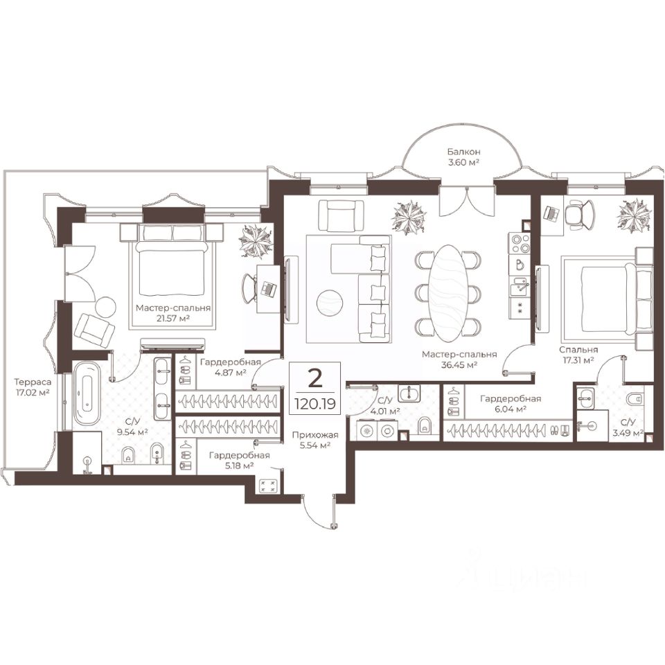 Продается 2-к квартира площадью 120.19 кв. м без отделки. Квартира находится на 5 этаже.