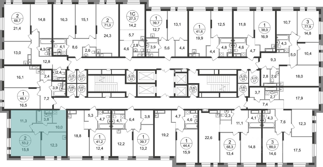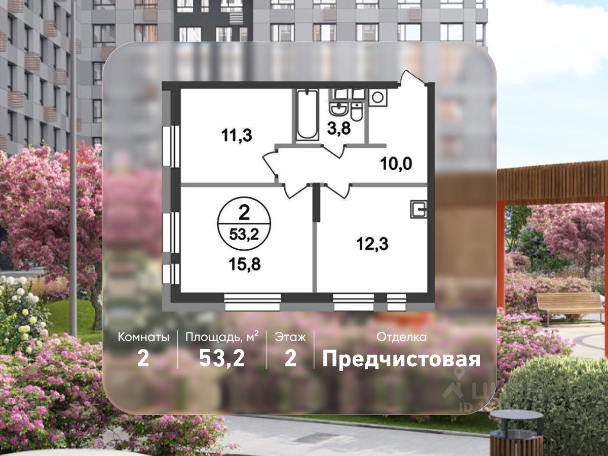Общая площадь квартиры - 53,2 кв. м, этаж 2 из 22.
