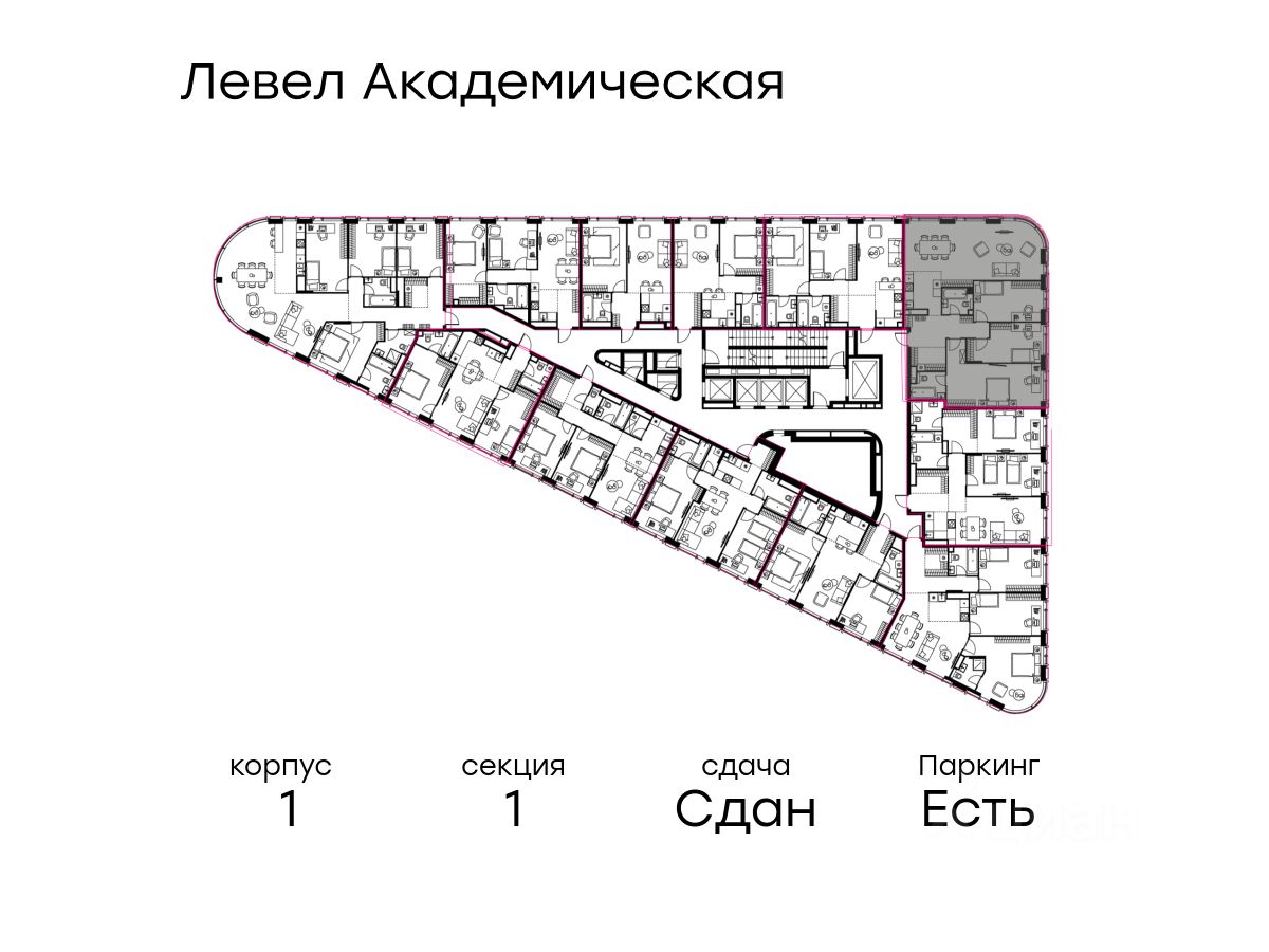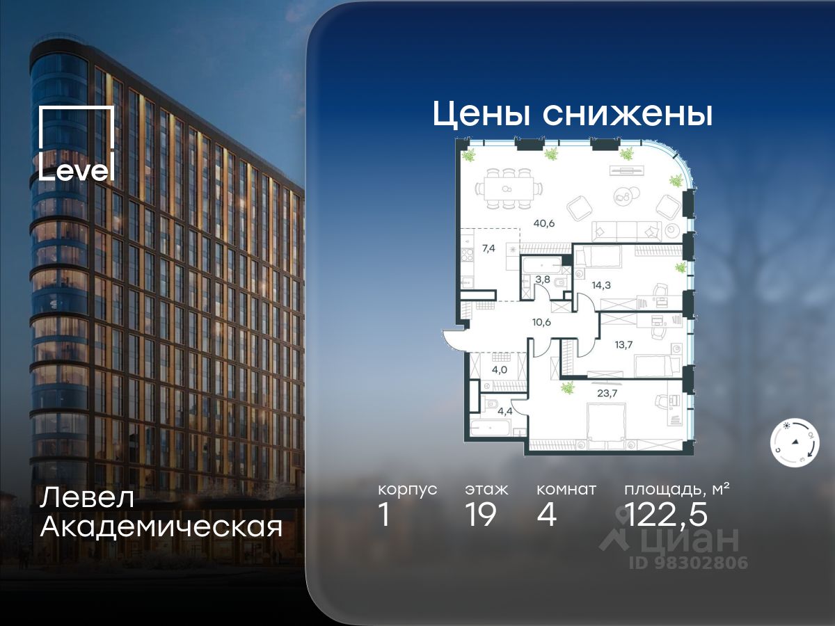 В Академическом районе продаётся 4-комнатная квартира площадью 122.50 кв.м без отделки. Квартира расположена на 19-м этаже 19-этажного жилого комплекса бизнес-класса Левел Академическая (компания Level Group).