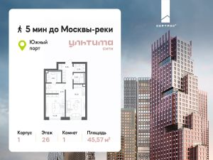 Продаётся 1-комнатная квартира от застройщика ГК "КОРТРОС" в жилом комплексе бизнес-класса УЛЬТИМА Сити. Квартира расположена на 26 этаже 45 этажного корпуса 1. Общая площадь 45,57 м². Без отделки.