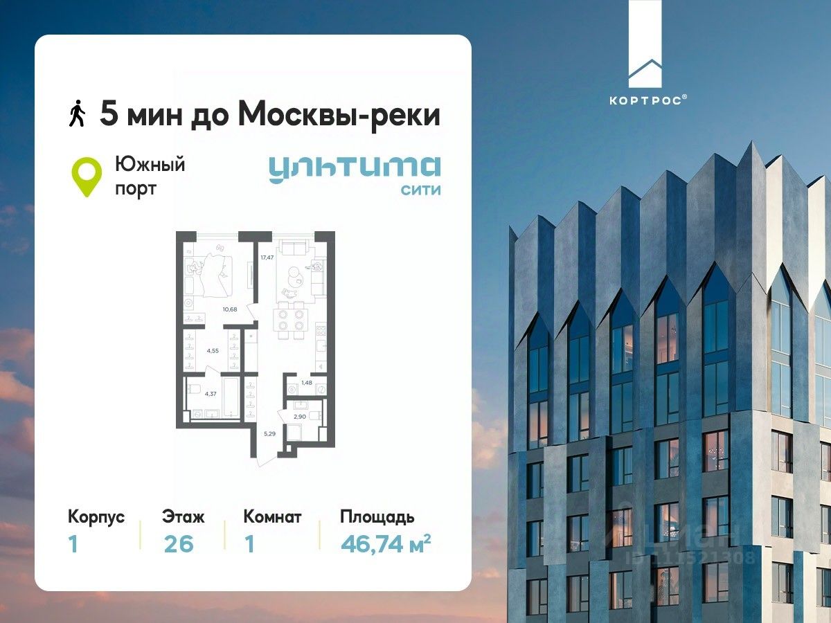 Продаётся 1-комнатная квартира от застройщика ГК "КОРТРОС" в жилом комплексе бизнес-класса УЛЬТИМА Сити. Квартира расположена на 26 этаже 45 этажного корпуса 1. Общая площадь 46,74 м². Без отделки.