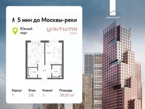Продаётся 1-комнатная квартира от застройщика ГК "КОРТРОС" в жилом комплексе бизнес-класса УЛЬТИМА Сити. Квартира расположена на 26 этаже 45 этажного корпуса 1. Общая площадь 39,81 м². Без отделки.