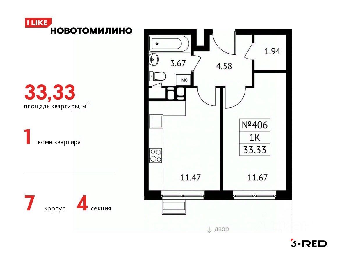 Продаётся 1-комнатная квартира в строящемся доме (Корпус 7), срок сдачи: IV-кв. 2028, общей площадью 33.33 кв.м., на 4 этаже. ЖК Новотомилино - комплексная жилая застройка из четырех многоэтажных жилых домов переменной этажности 1-17 этажей.