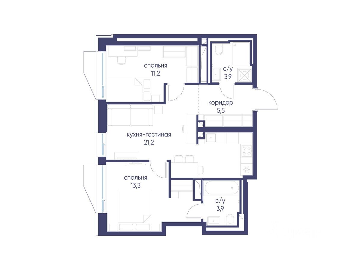 Продается 2-комнатная квартира от застройщика: общая площадь 59.00 м², жилая 24.50 м², кухня 21.20 м², 3-й этаж, жилой квартал "Гордость", корпус 40 (секция 1). Срок сдачи: 2 квартал 2029 года.