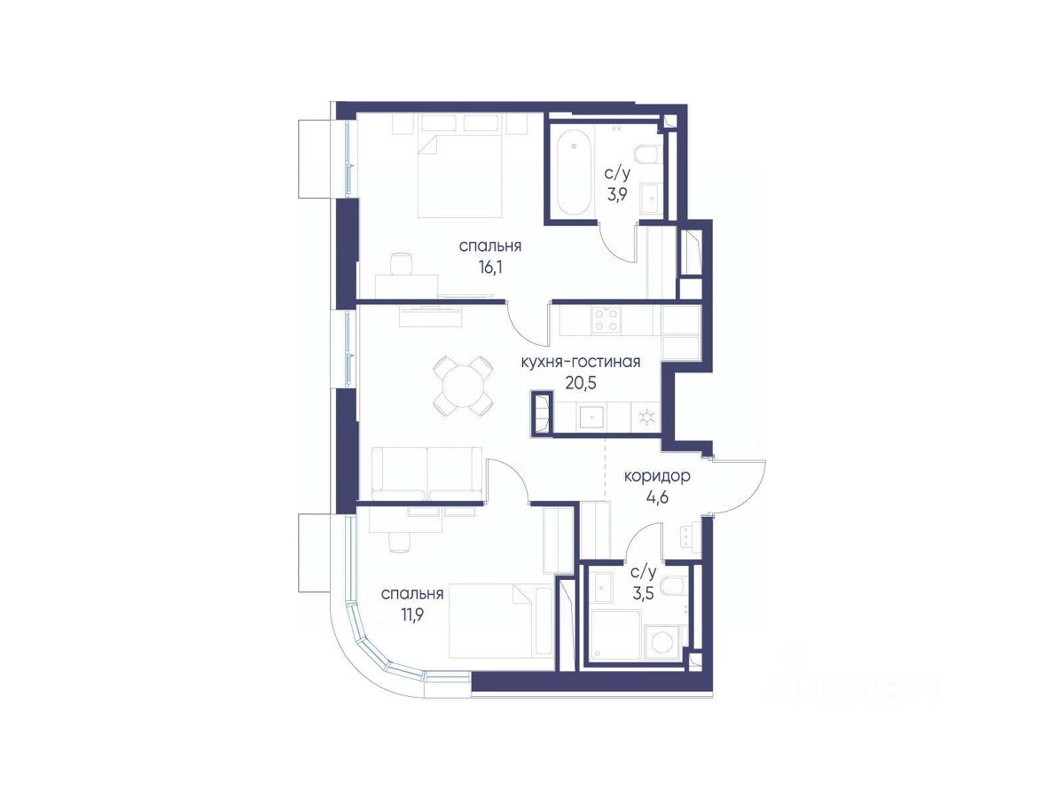Продается 2-комнатная квартира от застройщика: общая площадь 60.50 м², жилая 28.00 м², кухня 20.50 м², 3-й этаж, жилой квартал "Гордость", корпус 40 (секция 1). Срок сдачи: 2 квартал 2029 года.