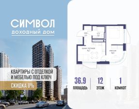 Продается 1-комнатная квартира от застройщика: общая площадь 36.90 м², жилая 14.10 м², кухня 15.60 м², 12-й этаж, жилой квартал "Гордость", корпус 40 (секция 1). Срок сдачи: 2 квартал 2029 года.