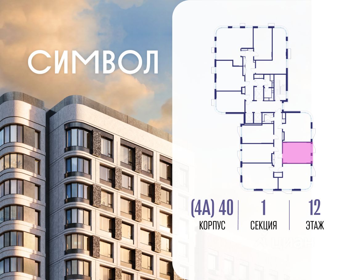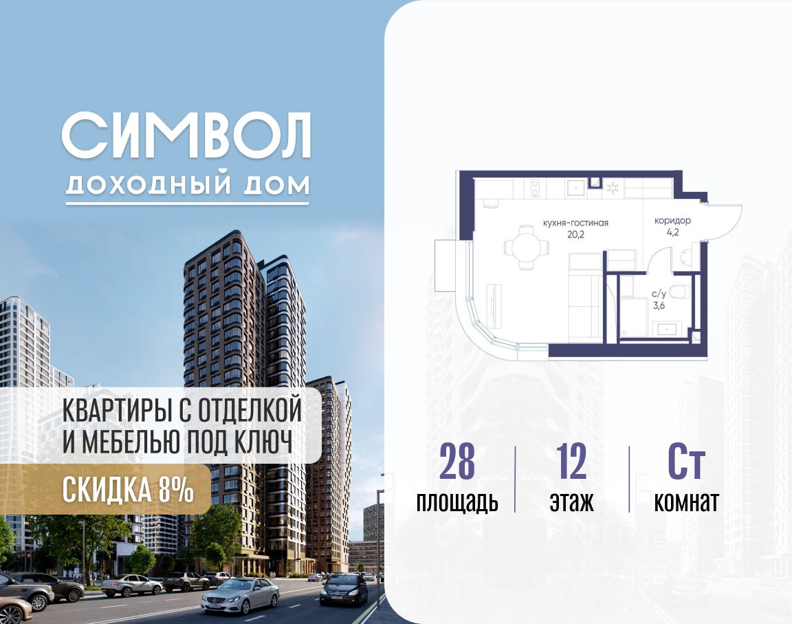 Продается квартира-студия от застройщика: общая площадь 28.00 м², жилая 15.60 м², кухня 5.00 м², 12-й этаж, жилой квартал "Гордость", корпус 40 (секция 1). Срок сдачи: 2 квартал 2029 года.