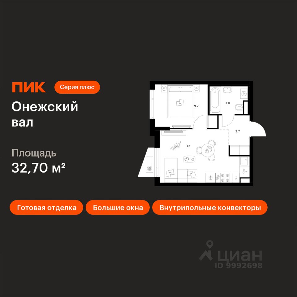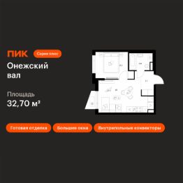 Продаётся 1-комн. квартира площадью 32,7 кв.м на 8 этаже 9 этажного дома (Корпус 1.1.4, Секция 4) проекта ПИК Онежский вал. Светлый просторный подъезд на уровне земли, функциональная планировка, большие окна, c отделкой.