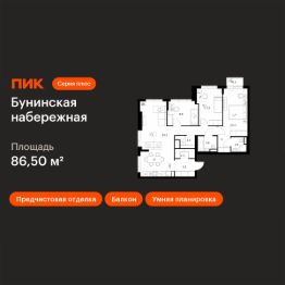 Продаётся 3-комн. квартира площадью 86,5 кв.м на 2 этаже 16 этажного дома (Корпус 2.6/1.2, Секция 2) проекта ПИК Бунинская набережная. Светлый просторный подъезд на уровне земли, функциональная планировка, большие окна, предчистовая отделка.