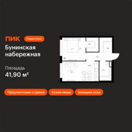 Продаётся 1-комн. квартира площадью 41,9 кв.м на 4 этаже 16 этажного дома (Корпус 2.6/1.2, Секция 2) проекта ПИК Бунинская набережная. Светлый просторный подъезд на уровне земли, функциональная планировка, большие окна, предчистовая отделка.