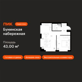 Продаётся 1-комн. квартира площадью 43 кв.м на 9 этаже 16 этажного дома (Корпус 2.6/1.3, Секция 3) проекта ПИК Бунинская набережная. Светлый просторный подъезд на уровне земли, функциональная планировка, большие окна, c отделкой.