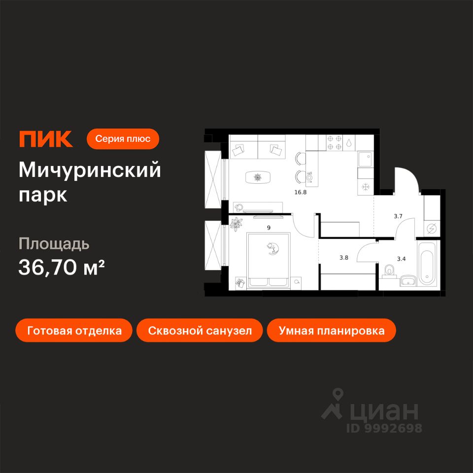 Продаётся 1-комн. квартира площадью 36,7 кв.м на 13 этаже 23 этажного дома (Корпус 4.4, Секция 1) проекта ПИК Мичуринский парк. Светлый просторный подъезд на уровне земли, функциональная планировка, большие окна, c отделкой.