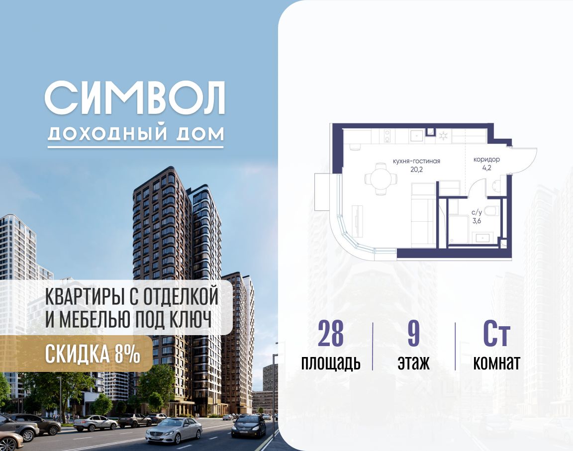 Продается квартира-студия от застройщика: общая площадь 28.00 м², жилая 15.20 м², кухня 5.00 м², 9-й этаж, жилой квартал "Гордость", корпус 40 (секция 1). Срок сдачи: 2 квартал 2029 года.