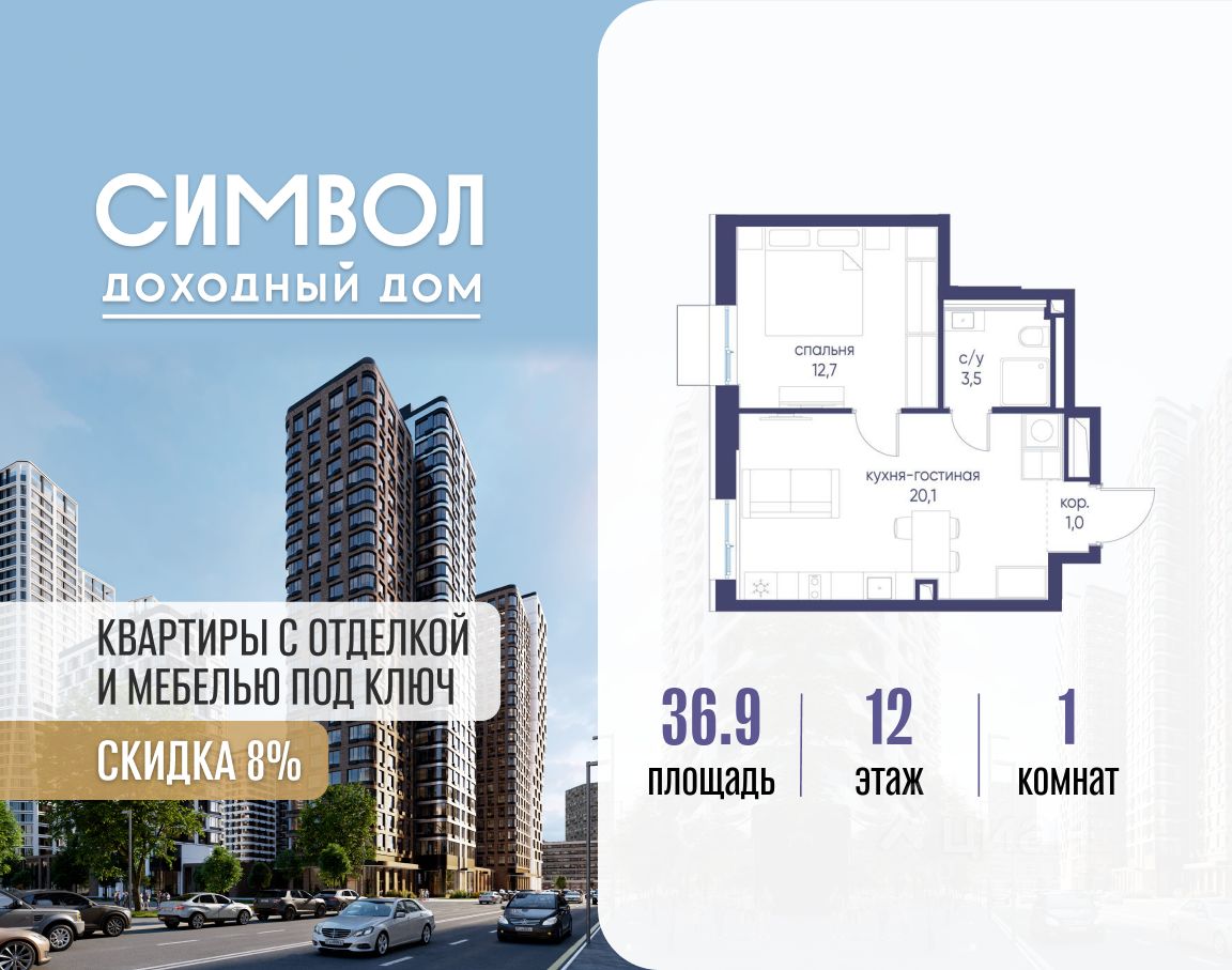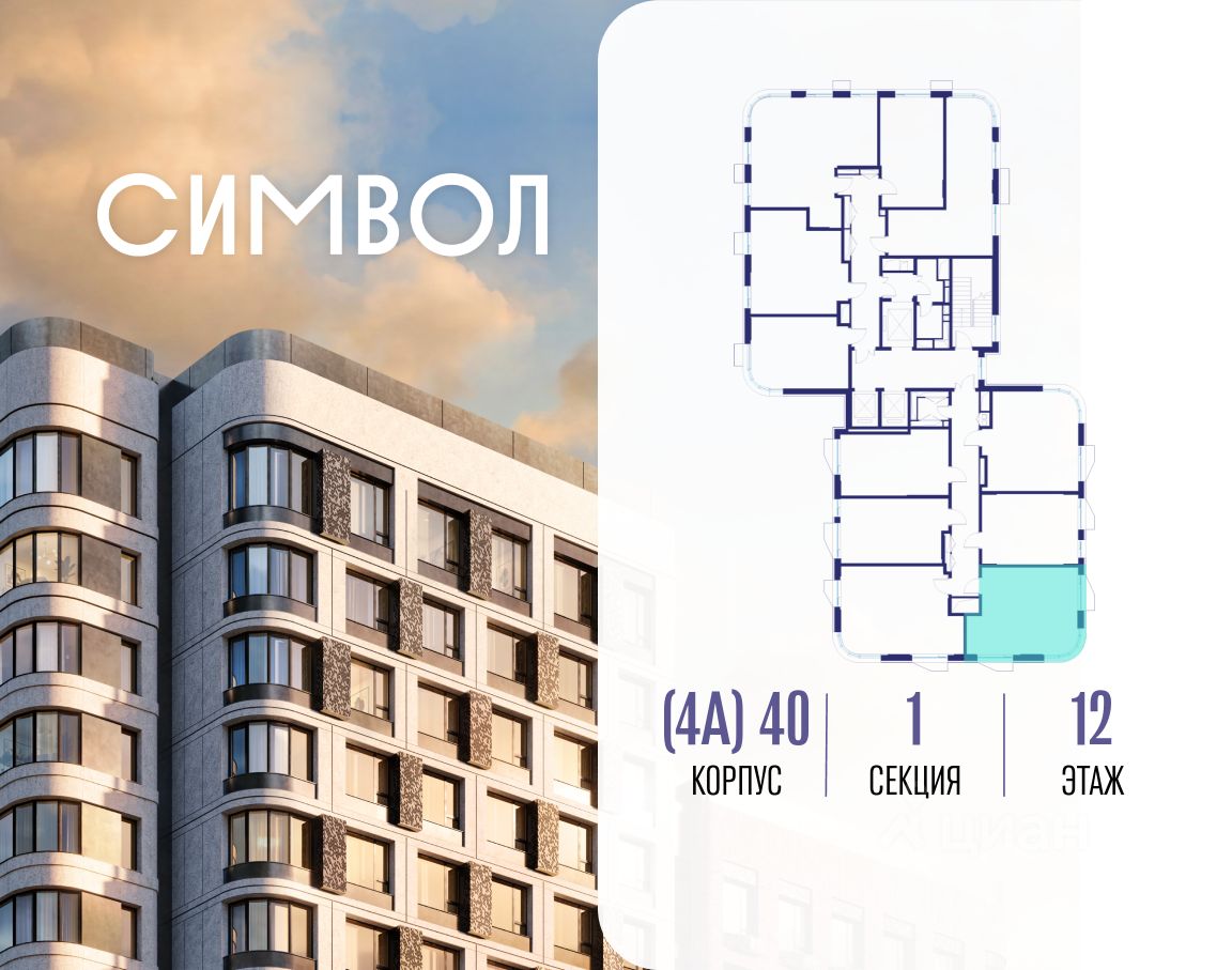 Продается 1-комнатная квартира от застройщика: общая площадь 36.90 м², жилая 16.00 м², кухня 14.70 м², 12-й этаж, жилой квартал "Гордость", корпус 40 (секция 1). Срок сдачи: 2 квартал 2029 года.