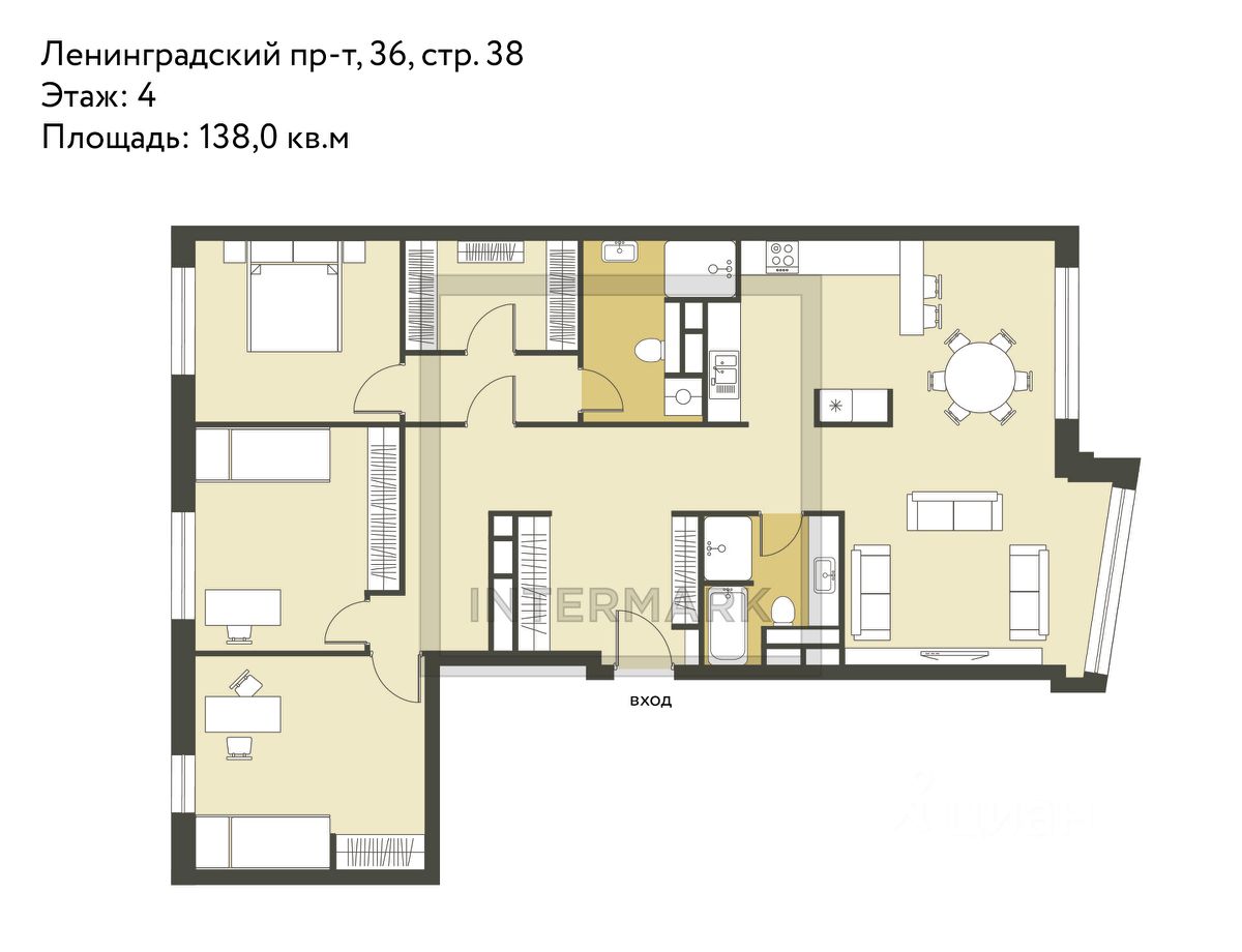 ID 65035. ЖК ВТБ Арена Парк. Апартамент с тремя спальнями в жилом комплексе ВТБ Арена Парк по адресу Ленинградский проспект, 36 стр. 38. Общая площадь - 138 м2, апартамент расположен на 4 этаже 15-ти этажного здания. Большие панорамные окна с великолепным видом на парк делают пространство гостиной светлым и комфортным. Окна спален ориентированы во двор с ландшафтным дизайном. . В апартаменте выполнен ремонт, установлена мебель и бытовая техника. Планировкой предусмотрено просторная гостиная с кухней, три спальни, холл, гардеробные и санузлы, много места для хранения. Комплекс оборудован современными инженерными системами: центральная система кондиционирования и приточной вентиляции. Преимуществом ЖК ВТБ Арена парк является наличие парка в шаговой доступности, большой закрытый двор. Фасады зданий выполнены из натурального благородного камня, окна - панорамные лучшей фирмы по шумо- и теплоизоляции Schuco. Во входных группах предусмотрены стойки ресепшен, колясочные, а также, помимо основных лифтов, есть сервисный лифт.