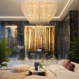 Просторное гранд-лобби с высотой потолка 7м. Дизайн Гранд Лобби выполнен в стиле классических люксовых отелей с использованием премиальных материалов.