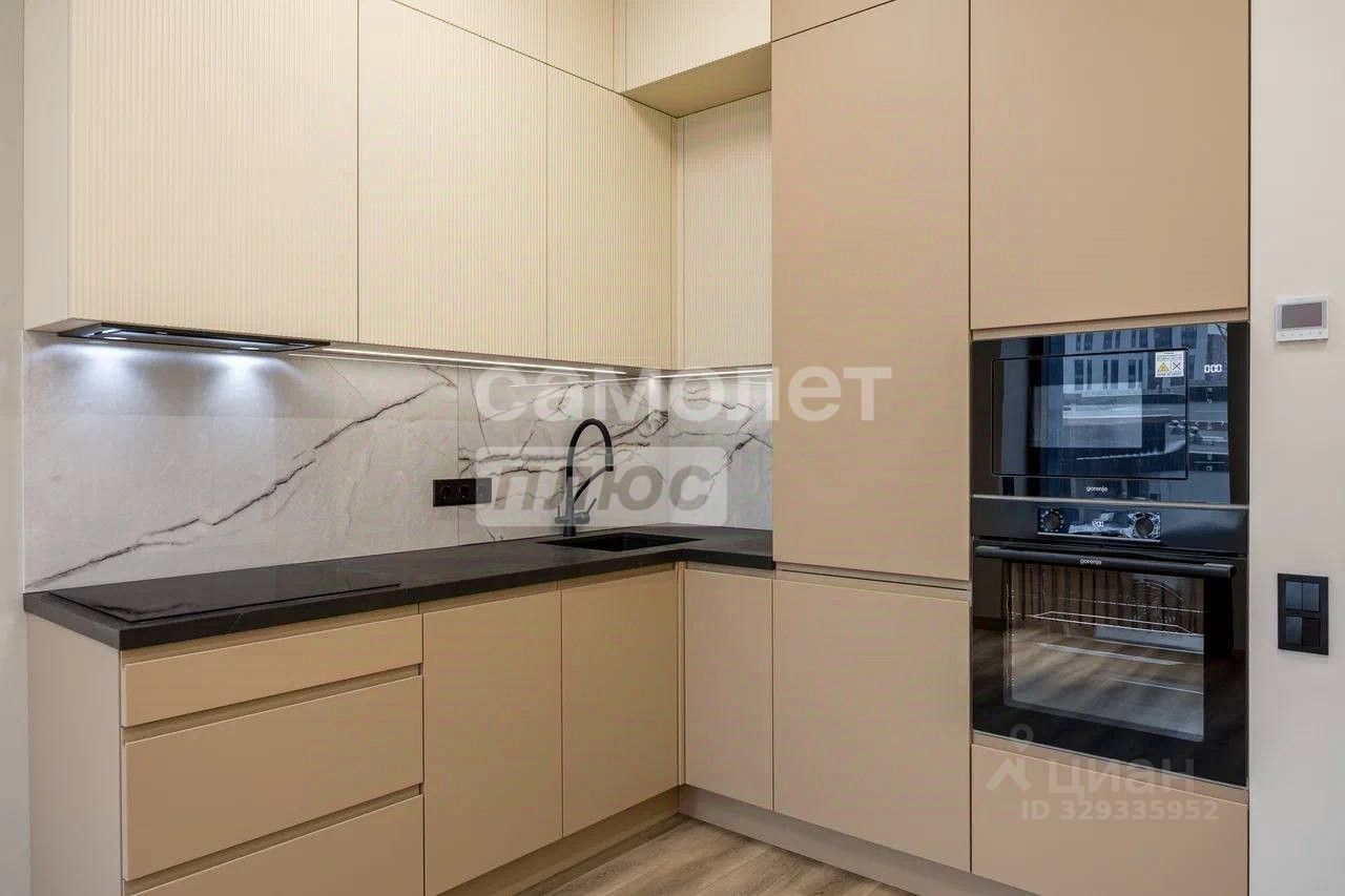 установлен современный кухонный гарнитур со встроенной техникой: индукционная плита, вытяжка, холодильник, микроволновая печь, духовой шкаф, посудомоечная машина; столешница из натурального камня.