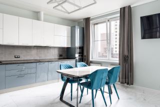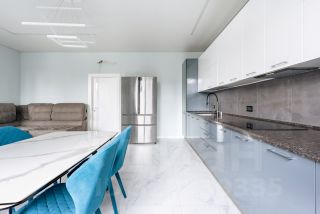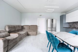 Просторная кухня-гостиная оснащена всей необходимой мебелью и бытовой техникой. Большой кухонный стол с удобными стульями идеальный вариант для вечерних семейных встреч.