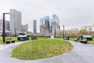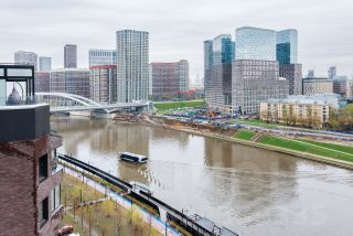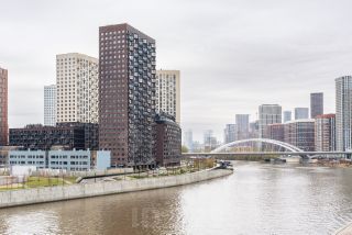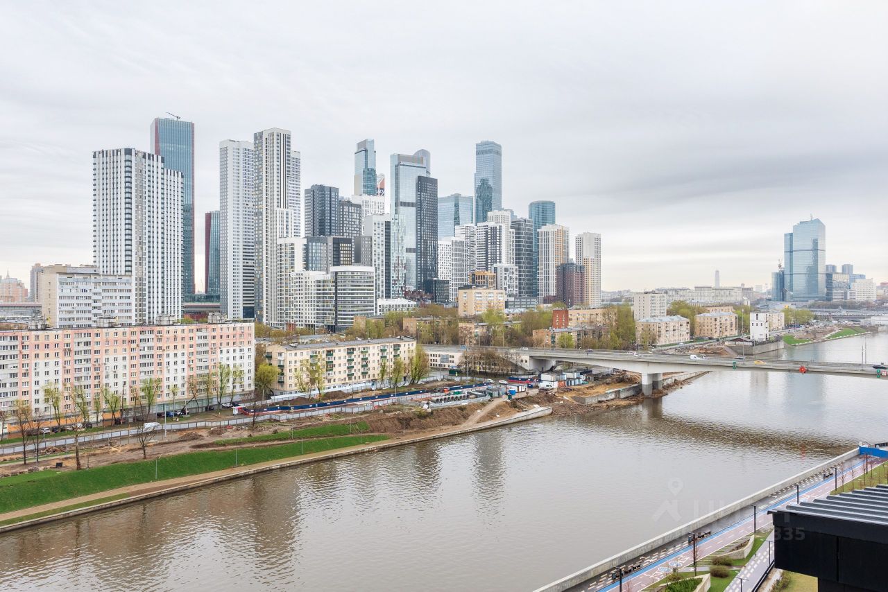 Вид на Москва-Сити, Серебряный Бор, набережную и воду.