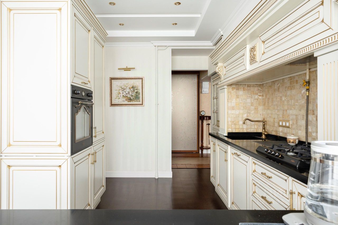 Подоконники и столешница на кухне из мрамора, кухня величественная и роскошная Джулия Новарс, окна Rehau, посудомойка Miele, Холодильник Libherr, духовка Smeg, стиральная машинка Electrolux, встроенная мебель Mr.Doors.