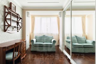 В просторной прихожей размещается вместительный встроенный шкаф-купе, калошница для обуви, удобный шкафчик с ящиками для хранения.